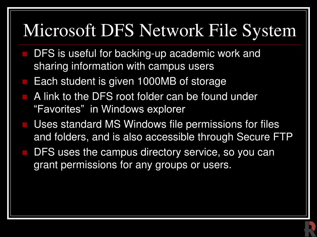 Microsoft DFS Network File System • DFS is useful for backing-up academic work and sharing information with campus users • Each student is given 1000MB of storage • A link to the DFS root folder can be found under “Favorites” in Windows explorer • Uses standard MS Windows file permissions for files and folders, and is also accessible through Secure FTP • DFS uses the campus directory service, so you can grant permissions for any groups or users.