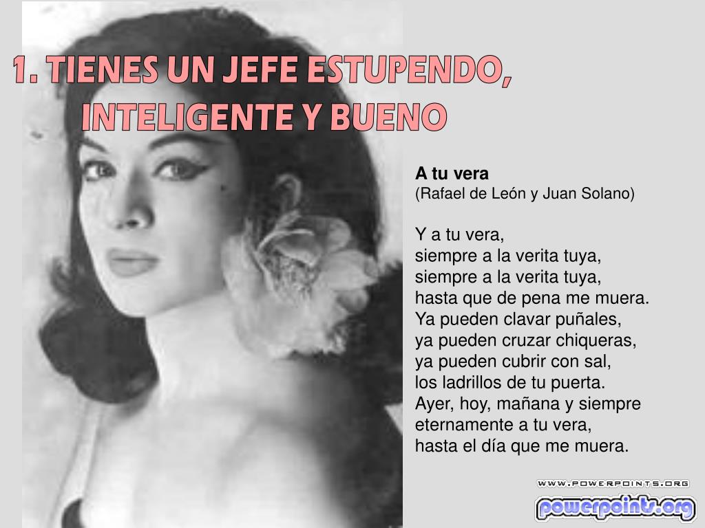 1. TIENES UN JEFE ESTUPENDO, INTELIGENTE Y BUENO A tu vera (Rafael de León y Juan Solano) Y a tu vera, siempre a la verita tuya, siempre a la verita tuya, hasta que de pena me muera. Ya pueden clavar puñales, ya pueden cruzar chiqueras, ya pueden cubrir con sal, los ladrillos de tu puerta. Ayer, hoy, mañana y siempre eternamente a tu vera, hasta el día que me muera.