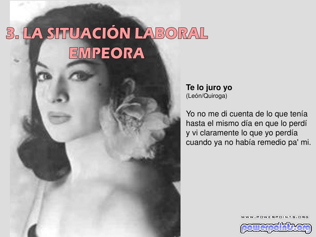 3. LA SITUACIÓN LABORAL EMPEORA Te lo juro yo(León/Quiroga) Yo no me di cuenta de lo que tenía hasta el mismo día en que lo perdí y vi claramente lo que yo perdía cuando ya no había remedio pa' mi.