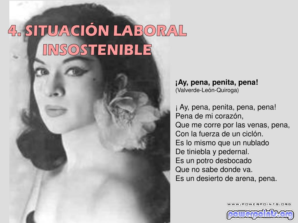 4. SITUACIÓN LABORAL INSOSTENIBLE ¡Ay, pena, penita, pena! (Valverde-León-Quiroga) ¡ Ay, pena, penita, pena, pena! Pena de mi corazón, Que me corre por las venas, pena, Con la fuerza de un ciclón. Es lo mismo que un nublado De tiniebla y pedernal. Es un potro desbocado Que no sabe donde va. Es un desierto de arena, pena.