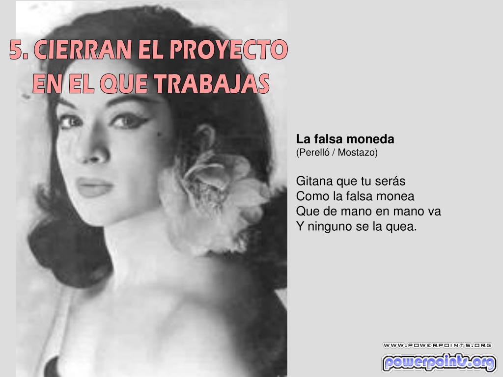 5. CIERRAN EL PROYECTO EN EL QUE TRABAJAS La falsa moneda (Perelló / Mostazo) Gitana que tu serás Como la falsa monea Que de mano en mano va Y ninguno se la quea.