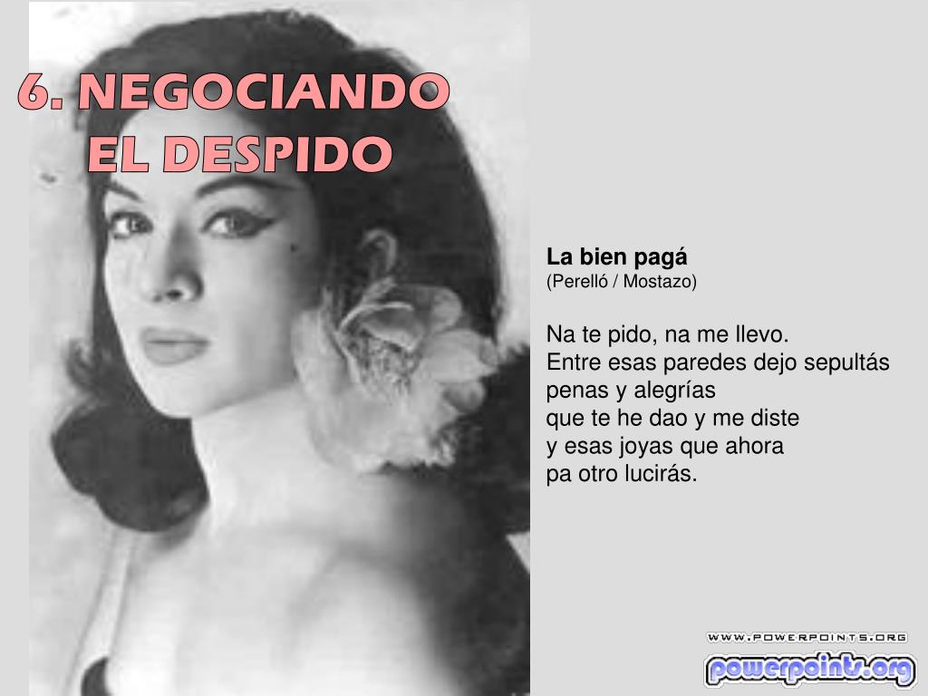 6. NEGOCIANDO EL DESPIDO La bien pagá (Perelló / Mostazo) Na te pido, na me llevo. Entre esas paredes dejo sepultás penas y alegrías que te he dao y me diste y esas joyas que ahora pa otro lucirás.