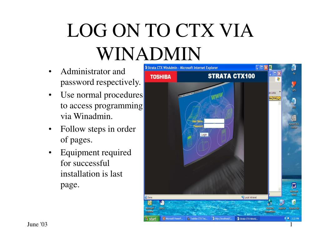 LOG ON TO CTX VIA WINADMIN • Administrator and password respectively. • Use normal procedures to access programming via Winadmin. • Follow steps in order of pages. • Equipment required for successful installation is last page.
