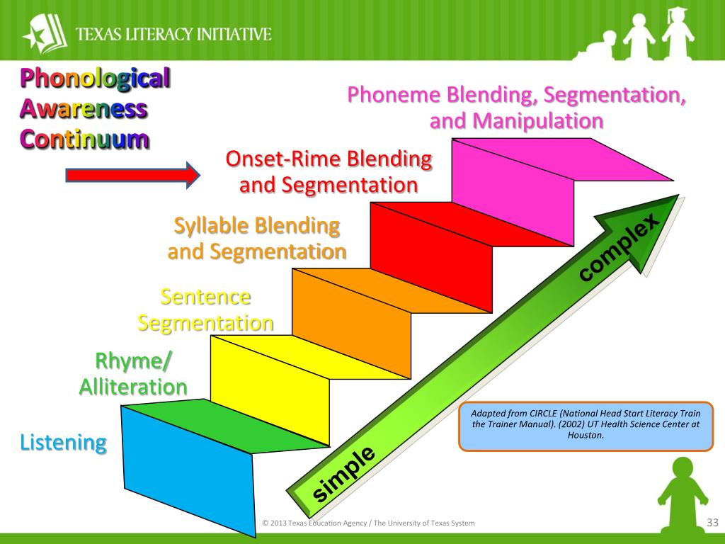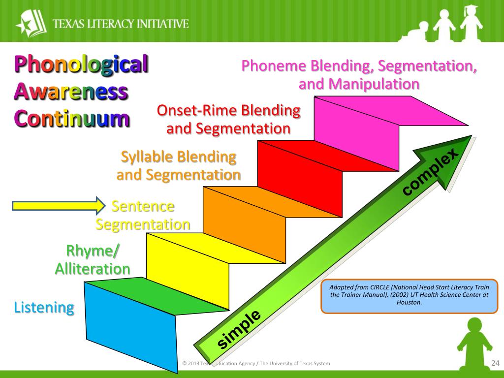 Phonological Awareness Continuum Phoneme Blending, Segmentation, and Manipulation Onset-Rime Blending and Segmentation Syllable Blending and Segmentation complex Sentence Segmentation Rhyme/ Alliteration Adapted from CIRCLE (National Head Start Literacy Train the Trainer Manual). (2002) UT Health Science Center at Houston. Listening simple
