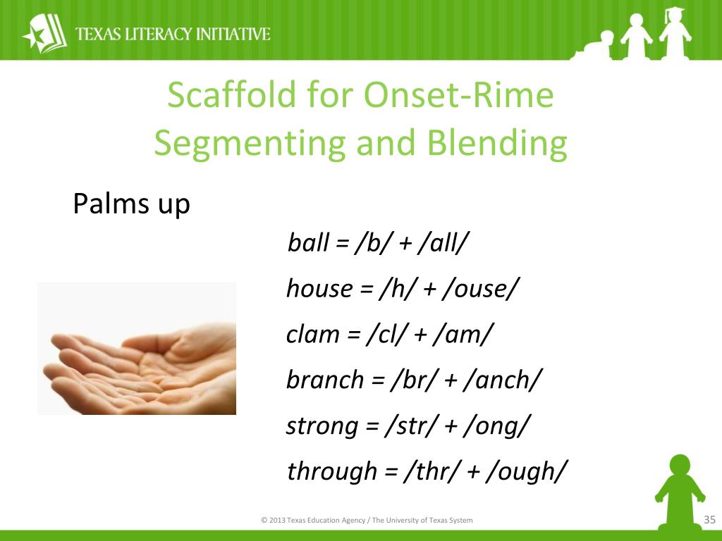 Scaffold for Onset-Rime Segmenting and Blending • Palms up • ball = /b/ + /all/ • house = /h/ + /ouse/ • clam = /cl/ + /am/ • branch = /br/ + /anch/ • strong = /str/ + /ong/ • through = /thr/ + /ough/
