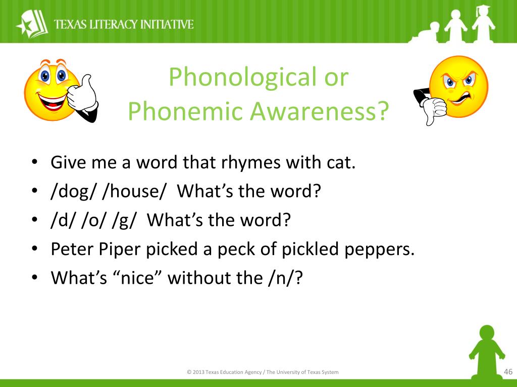Phonological or Phonemic Awareness? • Give me a word that rhymes with cat. • /dog/ /house/ What’s the word? • /d/ /o/ /g/ What’s the word? • Peter Piper picked a peck of pickled peppers. • What’s “nice” without the /n/?