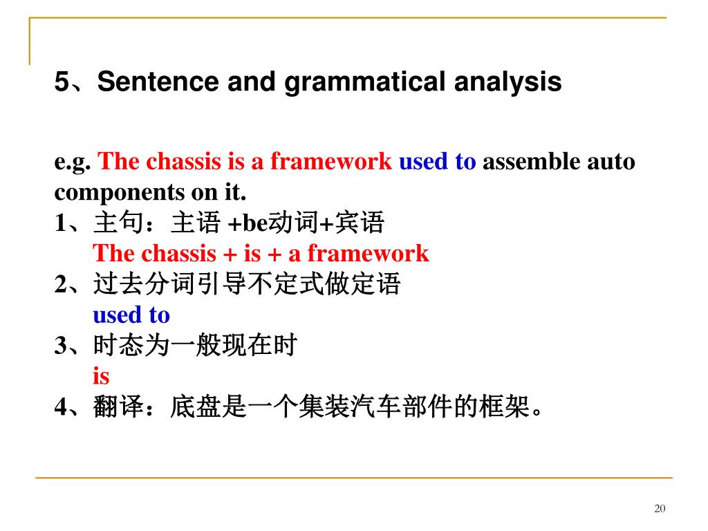 5、Sentence and grammatical analysis e.g. The chassis is a frameworkused to assemble auto components on it. 1、主句:主语 +be动词+宾语 The chassis + is + a framework 2、过去分词引导不定式做定语 used to 3、时态为一般现在时 is 4、翻译:底盘是一个集装汽车部件的框架。