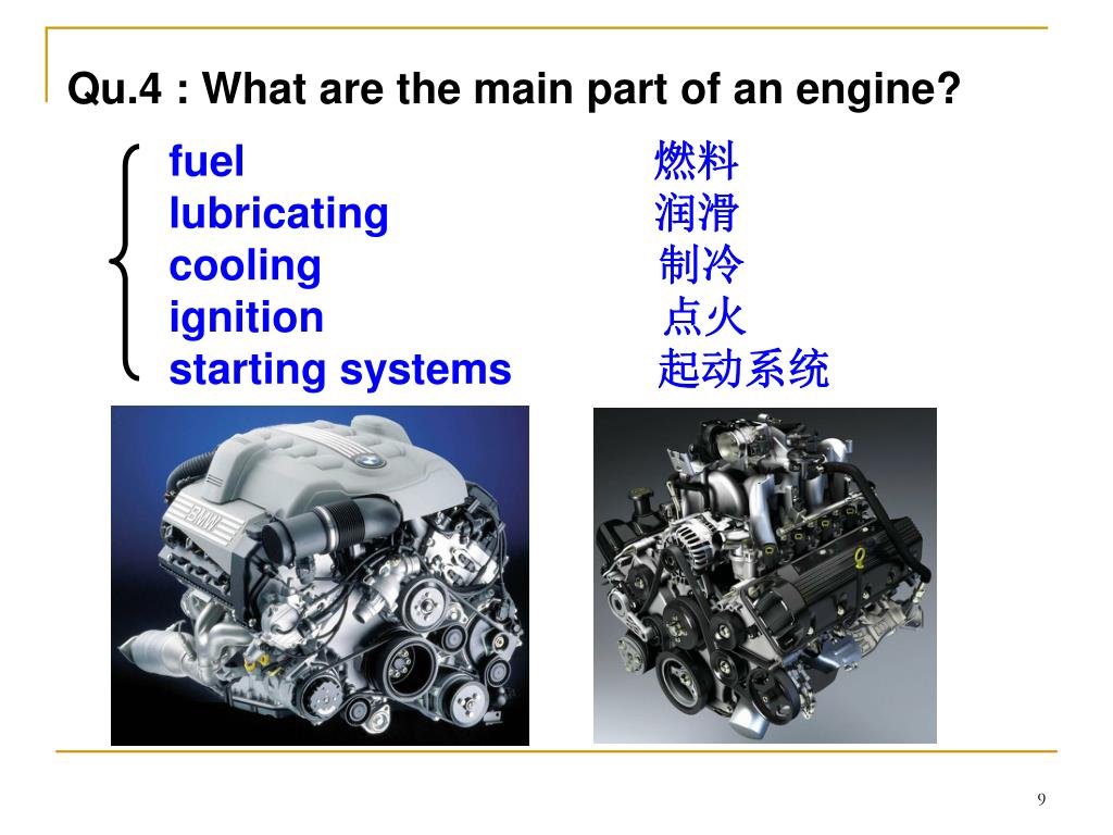 Qu.4 : What are the main part of an engine? fuel 燃料 lubricating 润滑 cooling 制冷 ignition 点火 starting systems 起动系统