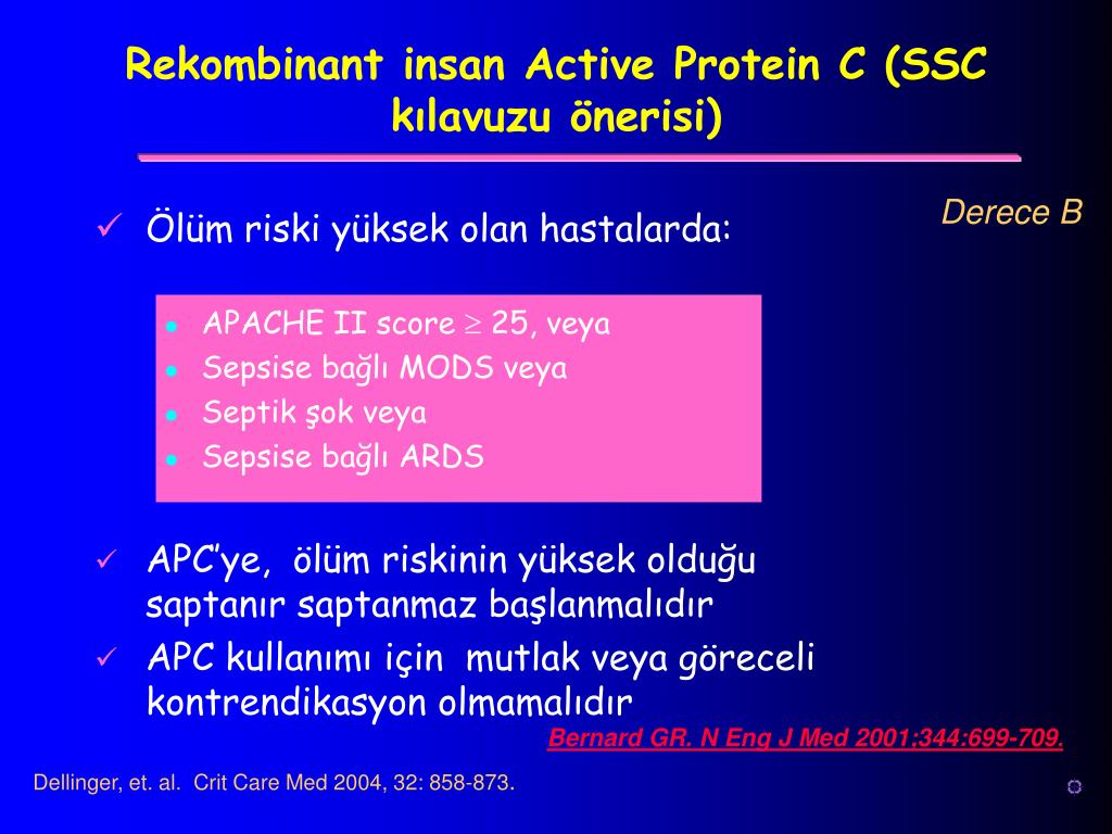 Rekombinant insan Active Protein C (SSC kılavuzu önerisi) Derece B • Ölüm riski yüksek olan hastalarda: • APACHE II score 25, veya • Sepsise bağlı MODS veya • Septikşok veya • Sepsise bağlı ARDS • APC’ye, ölüm riskinin yüksek olduğu saptanır saptanmaz başlanmalıdır • APC kullanımı için mutlak veya göreceli kontrendikasyon olmamalıdır Bernard GR. N Eng J Med 2001;344:699-709. Dellinger, et. al. Crit Care Med 2004, 32: 858-873.
