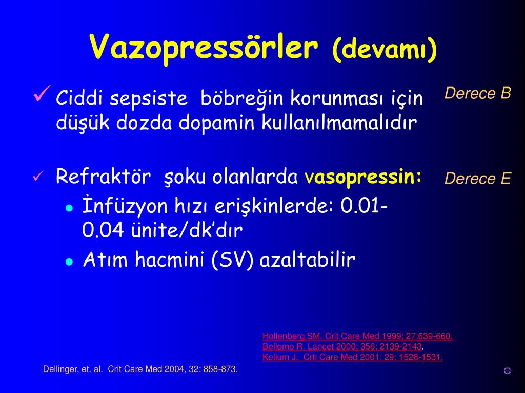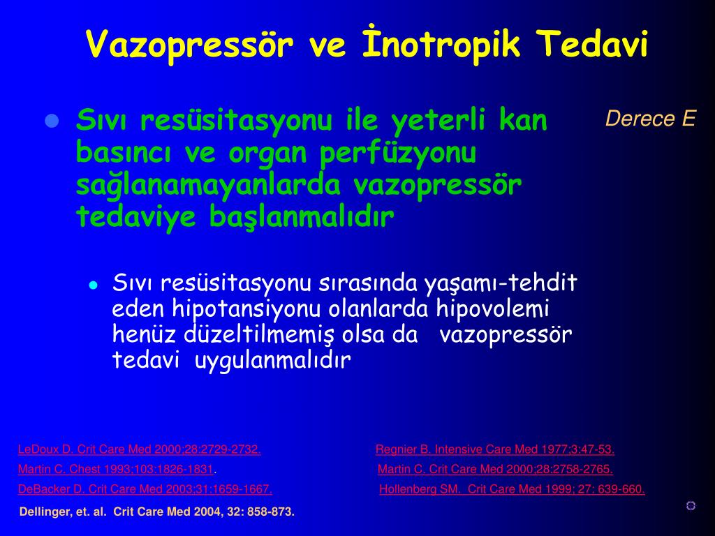 Septik şokta hipotansiyonun düzeltilmesinde ilk seçilecek ajan norepinefrinveya dopamindir Norepinefrindaha güçlüdür ve hipotansiyonun düzeltilmesinde daha etkin olabilir Dopamine özellikle sistolik fonksiyonu tehlikede olan hastalarda faydalı olabilir. Daha fazla takikardi yapar ve daha aritmojenik olabilir Derece D Vazopressörler (devamı) LeDoux D. Crit Care Med 2000;28:2729-2732.Regnier B. Intensive Care Med 1977;3:47-53. Martin C. Chest 1993;103:1826-1831. Martin C. Crit Care Med 2000;28:2758-2765. DeBacker D. Crit Care Med 2003;31:1659-1667.Hollenberg SM. Crit Care Med 1999; 27: 639-660. Dellinger, et. al. Crit Care Med 2004, 32: 858-873