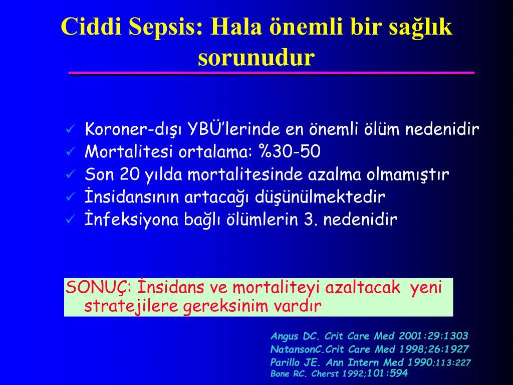 Koroner-dışı YBÜ’lerinde en önemli ölüm nedenidir Mortalitesi ortalama: %30-50 Son 20 yılda mortalitesinde azalma olmamıştır İnsidansının artacağı düşünülmektedir İnfeksiyona bağlı ölümlerin 3. nedenidir SONUÇ: İnsidans ve mortaliteyi azaltacak yeni stratejilere gereksinim vardır Angus DC. Crit Care Med 2001:29:1303 NatansonC.Crit Care Med 1998;26:1927 Parillo JE. Ann Intern Med 1990;113:227 Bone RC. Cherst 1992;101:594 Ciddi Sepsis: Hala önemli bir sağlık sorunudur