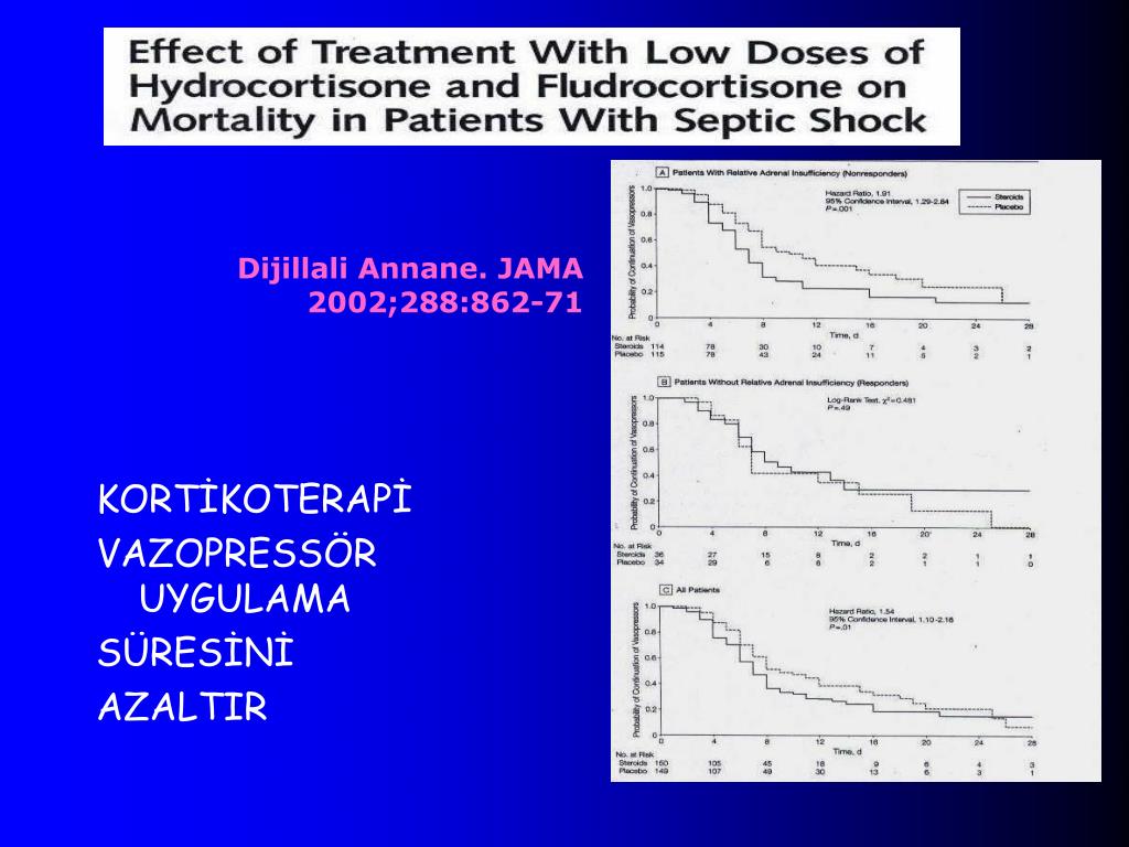 Dijillali Annane. JAMA 2002;288:862-71 KORTİKOTERAPİ VAZOPRESSÖR UYGULAMA SÜRESİNİ AZALTIR