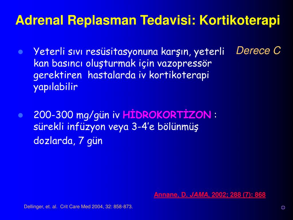 Adrenal Replasman Tedavisi: Kortikoterapi Derece C • Yeterli sıvı resüsitasyonuna karşın, yeterli kan basıncı oluşturmak için vazopressör gerektiren hastalarda iv kortikoterapi yapılabilir • 200-300 mg/gün iv HİDROKORTİZON : sürekli infüzyon veya 3-4’e bölünmüş dozlarda, 7 gün Annane, D. JAMA, 2002; 288 (7): 868 Dellinger, et. al. Crit Care Med 2004, 32: 858-873.