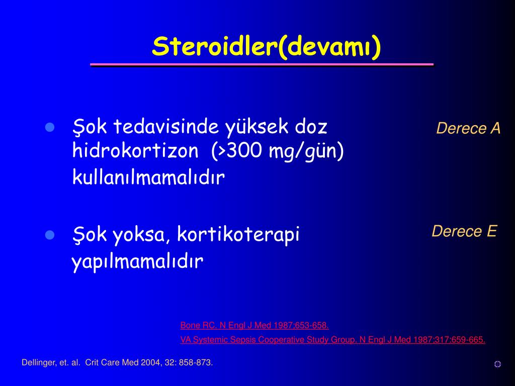 Steroidler(devamı) • Şok tedavisinde yüksek doz hidrokortizon (>300 mg/gün) kullanılmamalıdır • Şok yoksa, kortikoterapi yapılmamalıdır Derece A Derece E Bone RC. N Engl J Med 1987;653-658. VA Systemic Sepsis Cooperative Study Group. N Engl J Med 1987;317:659-665. Dellinger, et. al. Crit Care Med 2004, 32: 858-873.