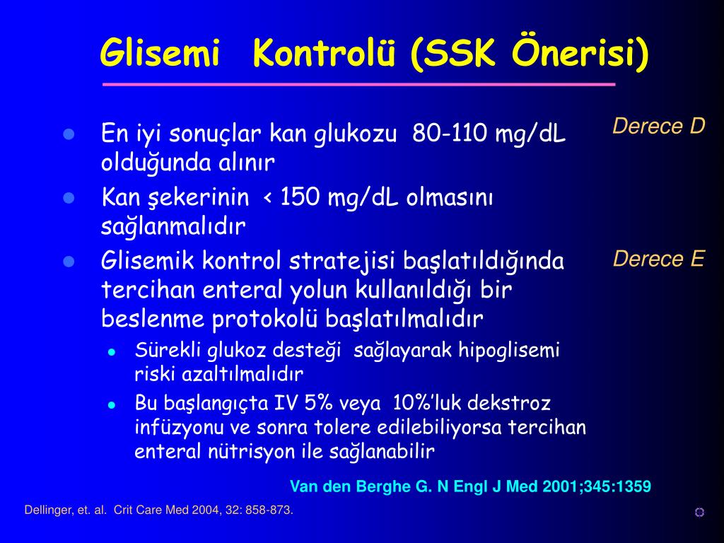 Glisemi Kontrolü (SSK Önerisi) Derece D • En iyi sonuçlar kan glukozu 80-110 mg/dL olduğunda alınır • Kan şekerinin < 150 mg/dL olmasını sağlanmalıdır • Glisemik kontrol stratejisi başlatıldığında tercihan enteral yolun kullanıldığı bir beslenme protokolü başlatılmalıdır • Sürekli glukoz desteği sağlayarak hipoglisemiriski azaltılmalıdır • Bu başlangıçta IV 5% veya 10%’luk dekstrozinfüzyonu ve sonra tolere edilebiliyorsa tercihan enteral nütrisyon ile sağlanabilir Derece E Van den Berghe G. N Engl J Med 2001;345:1359 Dellinger, et. al. Crit Care Med 2004, 32: 858-873.