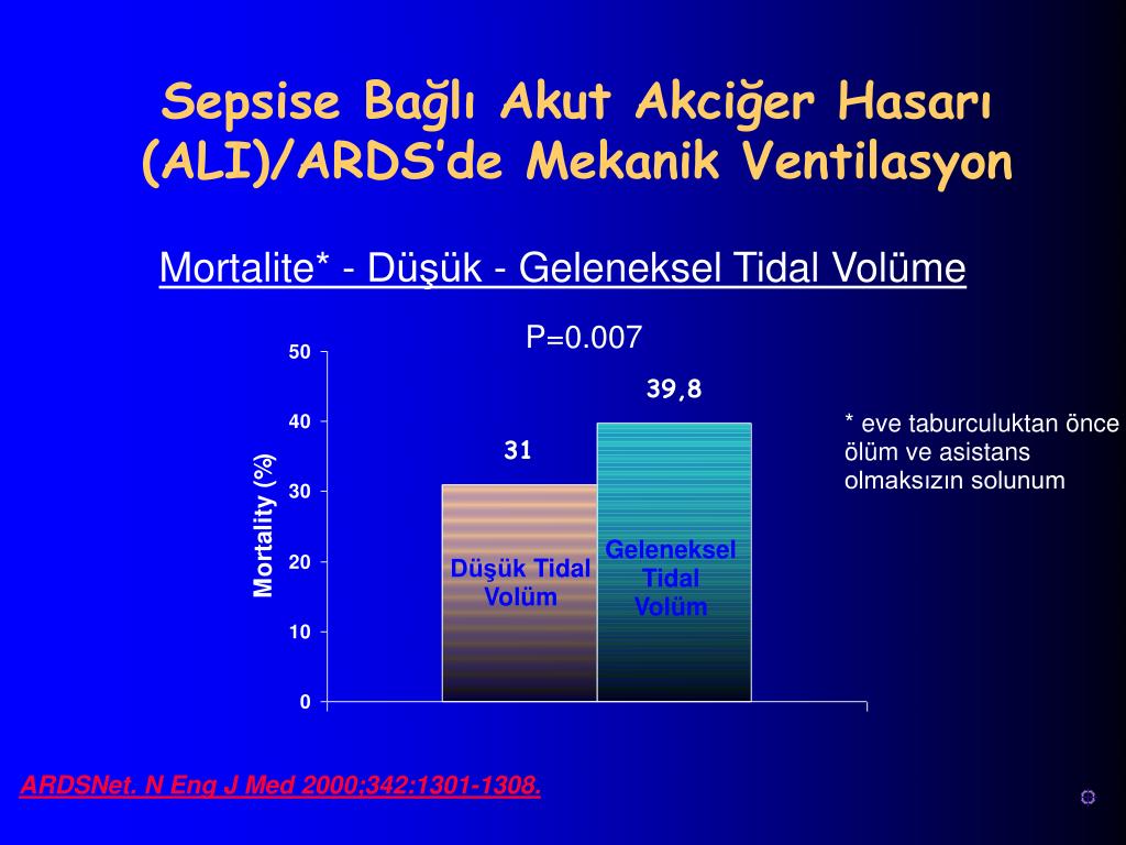 Sepsise Bağlı Akut Akciğer Hasarı (ALI)/ARDS’de Mekanik Ventilasyon Mortalite* - Düşük -Geleneksel Tidal Volüme P=0.007 * eve taburculuktan önce ölüm ve asistans olmaksızın solunum GelenekselTidal Volüm Düşük Tidal Volüm ARDSNet. N Eng J Med 2000;342:1301-1308.
