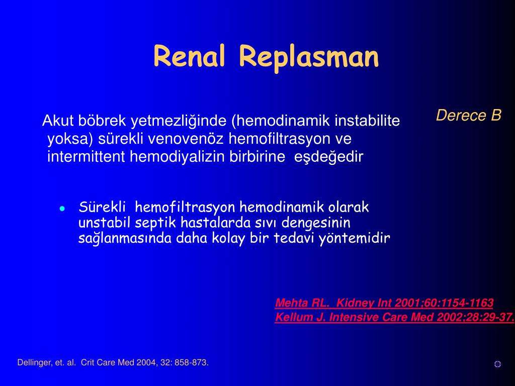 Renal Replasman Derece B Akut böbrek yetmezliğinde (hemodinamik instabilite yoksa) sürekli venovenöz hemofiltrasyon ve intermittent hemodiyalizin birbirine eşdeğedir • Sürekli hemofiltrasyon hemodinamik olarak unstabil septik hastalarda sıvı dengesinin sağlanmasında daha kolay bir tedavi yöntemidir Mehta RL. Kidney Int 2001;60:1154-1163 Kellum J. Intensive Care Med 2002;28:29-37. Dellinger, et. al. Crit Care Med 2004, 32: 858-873.