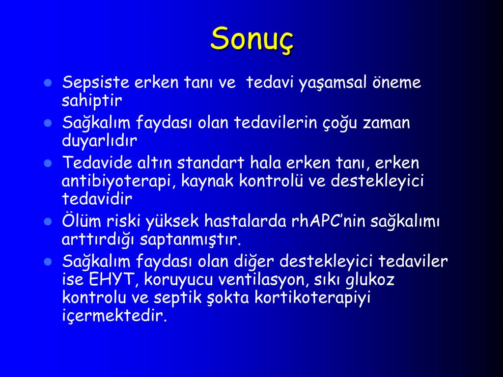 Sonuç • Sepsiste erken tanı ve tedavi yaşamsal öneme sahiptir • Sağkalım faydası olan tedavilerin çoğu zaman duyarlıdır • Tedavide altın standart hala erken tanı, erken antibiyoterapi, kaynak kontrolü ve destekleyici tedavidir • Ölüm riski yüksek hastalarda rhAPC’nin sağkalımı arttırdığı saptanmıştır. • Sağkalım faydası olan diğer destekleyici tedaviler ise EHYT, koruyucu ventilasyon, sıkı glukoz kontrolu ve septik şokta kortikoterapiyi içermektedir.