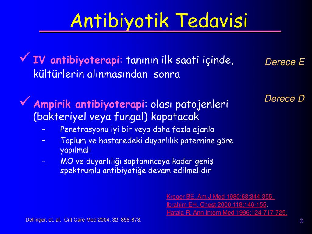Antibiyotik Tedavisi Derece E Derece D • IV antibiyoterapi: tanının ilk saati içinde, kültürlerin alınmasından sonra • Ampirik antibiyoterapi: olası patojenleri (bakteriyel veya fungal) kapatacak • Penetrasyonu iyi bir veya daha fazla ajanla • Toplum ve hastanedeki duyarlılık paternine göre yapılmalı • MO ve duyarlılığı saptanıncaya kadar geniş spektrumlu antibiyotiğe devam edilmelidir Kreger BE. Am J Med 1980;68:344-355. Ibrahim EH. Chest 2000;118:146-155. Hatala R. Ann Intern Med 1996;124-717-725. Dellinger, et. al. Crit Care Med 2004, 32: 858-873.
