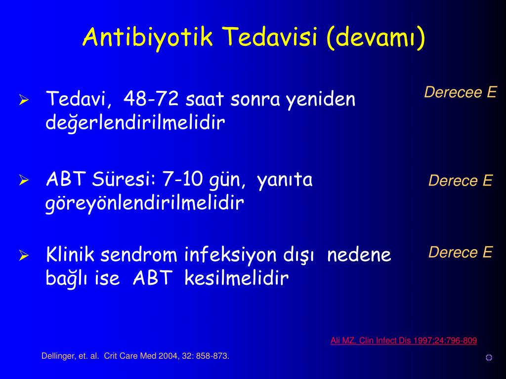 Antibiyotik Tedavisi (devamı) Derecee E • Tedavi, 48-72 saat sonra yeniden değerlendirilmelidir • ABT Süresi: 7-10 gün, yanıta göreyönlendirilmelidir • Klinik sendrom infeksiyon dışı nedene bağlı ise ABT kesilmelidir Derece E Derece E Ali MZ. Clin Infect Dis 1997;24:796-809 Dellinger, et. al. Crit Care Med 2004, 32: 858-873.