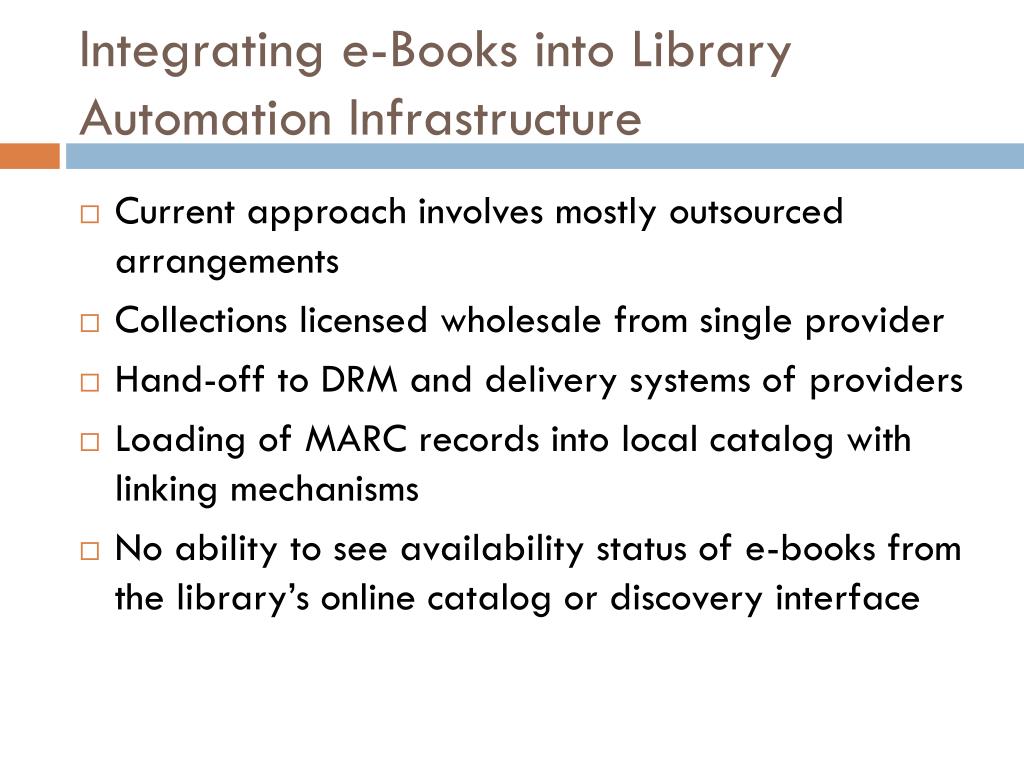 Integrating e-Books into Library Automation Infrastructure • Current approach involves mostly outsourced arrangements • Collections licensed wholesale from single provider • Hand-off to DRM and delivery systems of providers • Loading of MARC records into local catalog with linking mechanisms • No ability to see availability status of e-books from the library’s online catalog or discovery interface