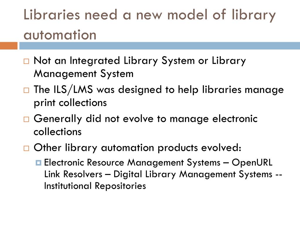 Libraries need a new model of library automation • Not an Integrated Library System or Library Management System • The ILS/LMSwas designed to help libraries manage print collections • Generally did not evolve to manage electronic collections • Other library automation products evolved: • Electronic Resource Management Systems – OpenURL Link Resolvers – Digital Library Management Systems -- Institutional Repositories