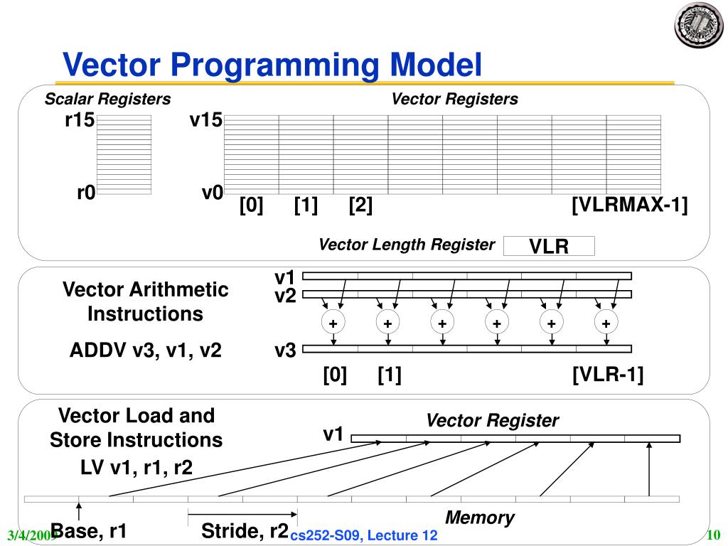 Vector Supercomputers Epitomized by Cray-1, 1976: Scalar Unit + Vector Extensions • Load/Store Architecture • Vector Registers • Vector Instructions • Hardwired Control • Highly Pipelined Functional Units • Interleaved Memory System • No Data Caches • No Virtual Memory cs252-S09, Lecture 12