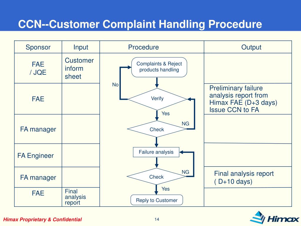 Sponsor Input Procedure Output FAE / JQE Customer inform sheet Complaints & Reject products handling No FAE Preliminary failure analysis report from Himax FAE (D+3 days) Issue CCN to FA Verify Yes FA manager NG Check FA Engineer Failure analysis FA manager Final analysis report ( D+10 days) NG Check Yes FAE Final analysis report Reply to Customer CCN--Customer Complaint Handling Procedure