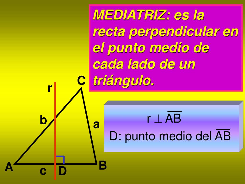r AB D: punto medio del AB MEDIATRIZ: es la recta perpendicular en el punto medio de cada lado de un triángulo. C r b a B A c D