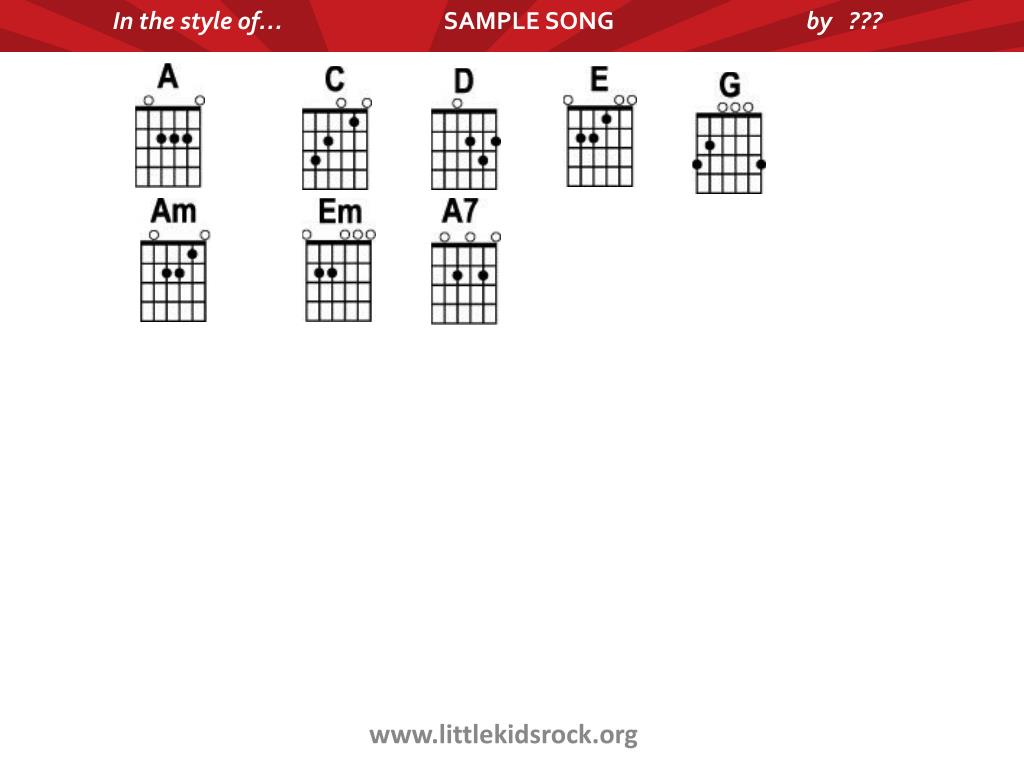 HOW TO USE THIS THING Skim through all the slides first to see what’s here Select and copy all the chords you need for your song from the slide marked “CHORDS” Skip to a “NEW SONG” slide and paste them in. Select and copy all the measures or bars you need for your song from the slide marked “MEASURES” Skip to the “NEW SONG” slide and paste the measures in. Rearrange all the chords and measures to build your own song. Print, project or otherwise provide your newly created song in class and proceed to rock… Share any cool songs you create with me! chuck@littlekidsrock.org
