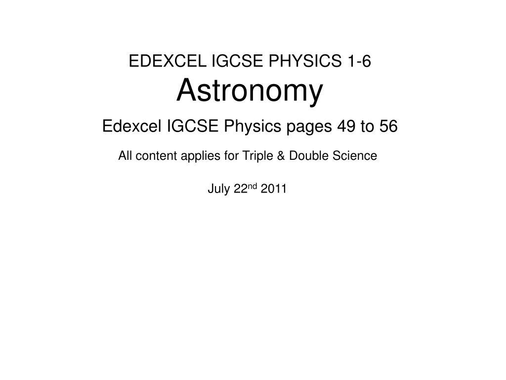 EDEXCEL IGCSE PHYSICS 1-6Astronomy All content applies for Triple & Double Science July 22nd 2011 Edexcel IGCSE Physics pages 49 to 56