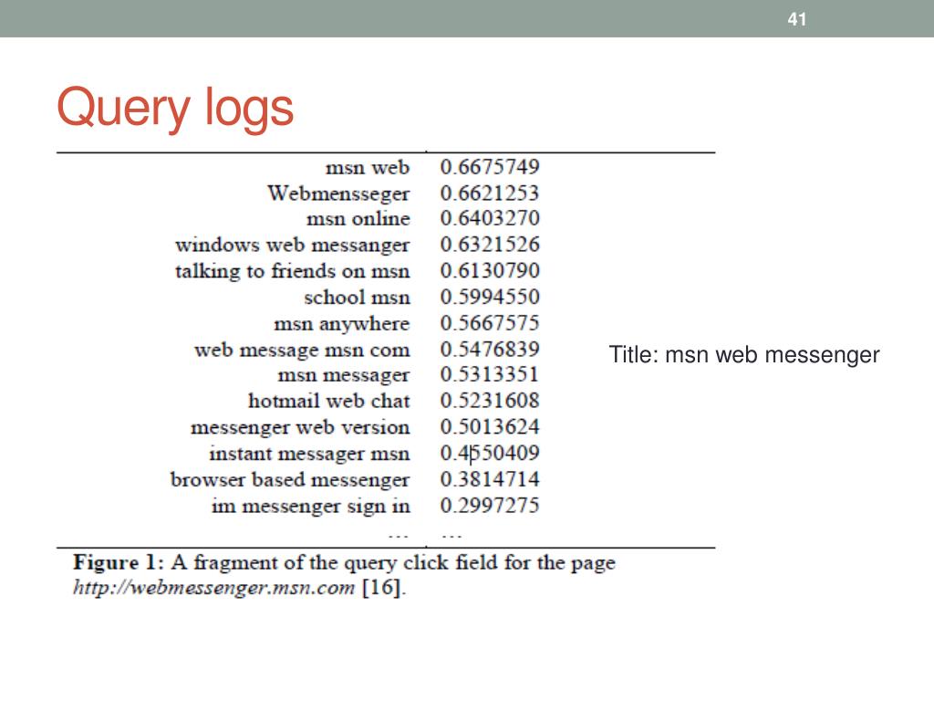 More flexible “Phrases” – n-grams for query Word generation process: • Select a segmentation S of Q according to P(S|Q), • Select a query phrase q according to P(q|S), and • Select a translation (i.e., expansion term) w according to P(w|q). Query Title instant messenger msn msn web messenger instant messenger msn msn web messenger Instant-messenger messenger-msn Instant-messenger-msn