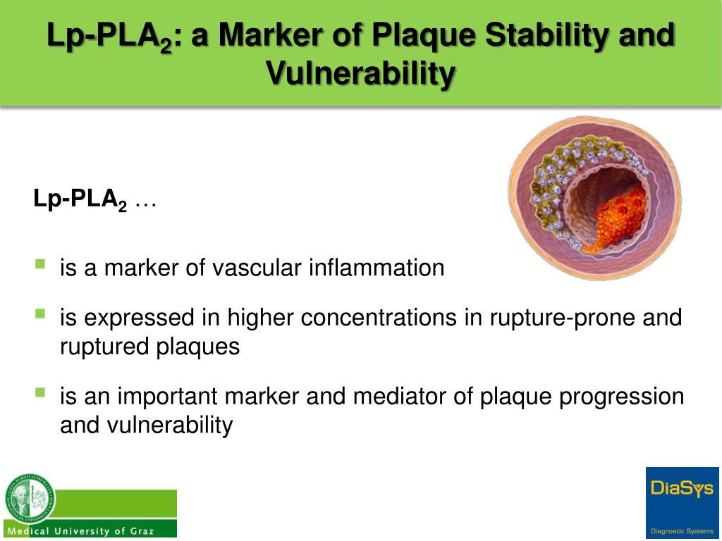 Lp-PLA2: a Marker of Plaque Stability and Vulnerability Lp-PLA2… • is a markerofvascularinflammation • is expressed in higherconcentrationsin rupture-prone and ruptured plaques • is an importantmarkerandmediator of plaqueprogressionand vulnerability