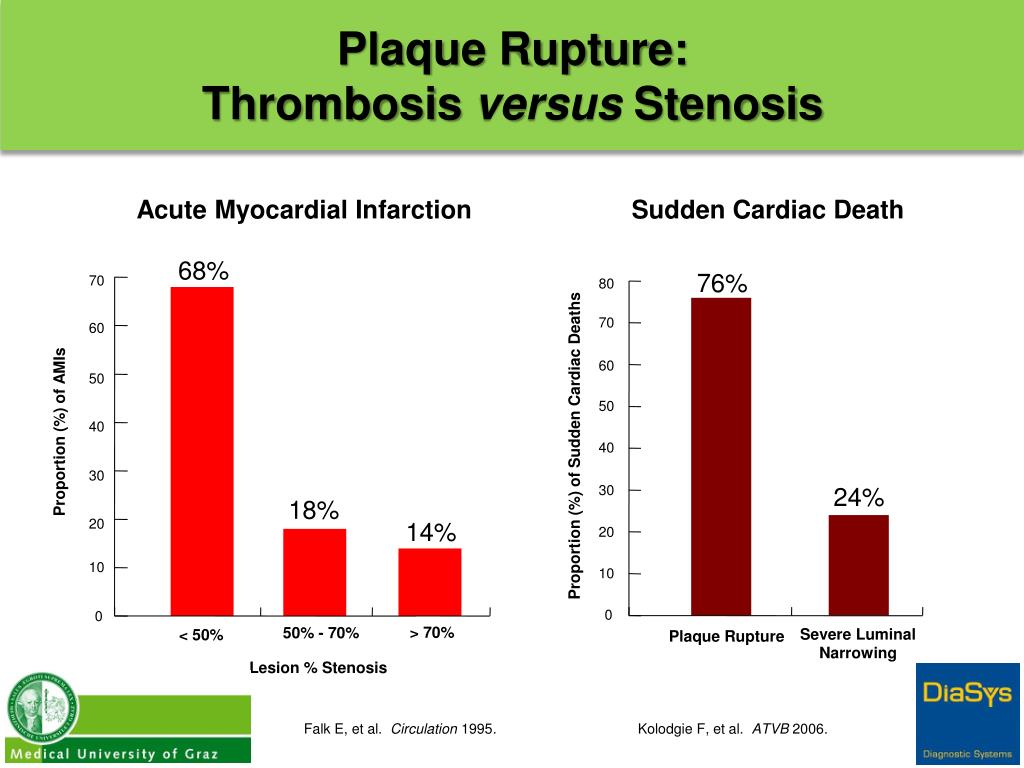 Plaque Rupture:Thrombosis versusStenosis Acute Myocardial Infarction Sudden Cardiac Death 68% 76% 70 80 70 60 60 50 50 40 Proportion (%) of AMIs Proportion (%) of Sudden Cardiac Deaths 40 30 24% 30 18% 20 14% 20 10 10 0 0 > 70% 50% - 70% Severe Luminal Narrowing < 50% Plaque Rupture Lesion % Stenosis Falk E, et al. Circulation 1995. Kolodgie F, et al. ATVB 2006.