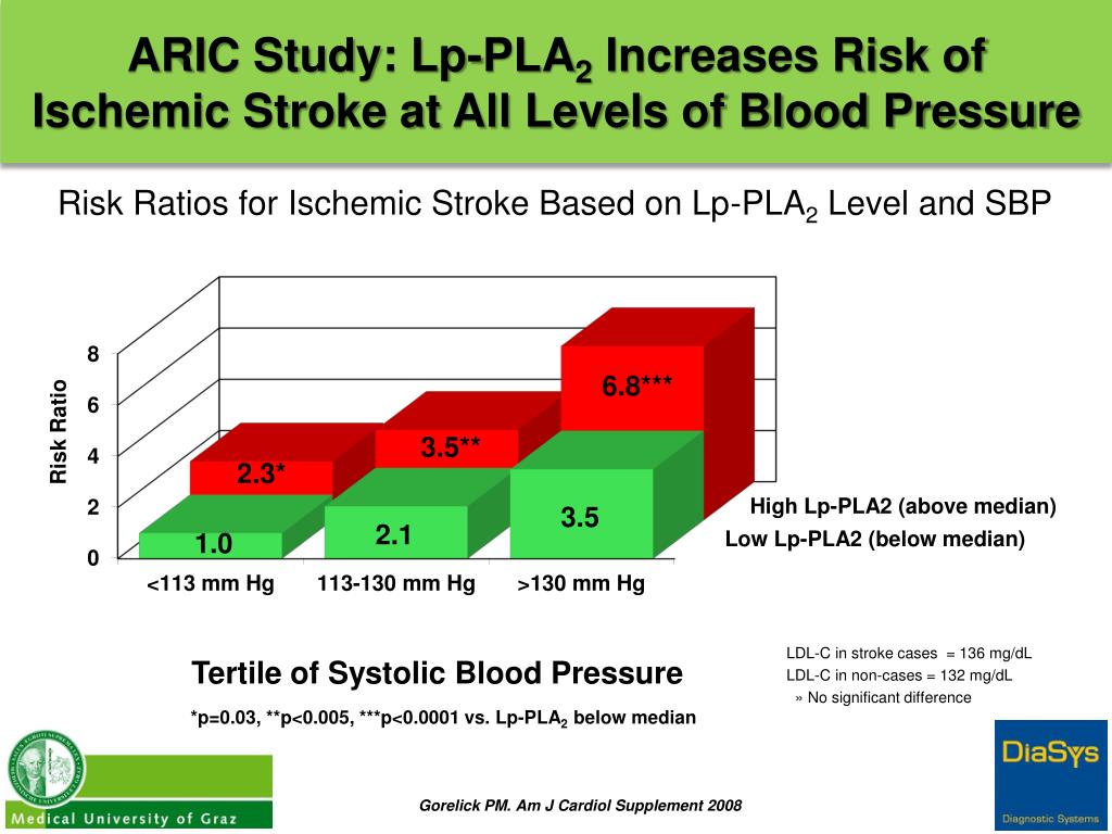 ARIC Study: Lp-PLA2 Increases Risk of Ischemic Stroke at All Levels of Blood Pressure Risk Ratios for Ischemic Stroke Based on Lp-PLA2 Level and SBP 6.8*** 6.8*** Risk Ratio 3.5** 3.5** 2.3* 2.3* High Lp-PLA2 (above median) 3.5 3.5 2.1 2.1 Low Lp-PLA2 (below median) 1.0 1.0 LDL-C in stroke cases = 136 mg/dL LDL-C in non-cases = 132 mg/dL » No significant difference Tertile of Systolic Blood Pressure *p=0.03, **p<0.005, ***p<0.0001 vs. Lp-PLA2 below median Gorelick PM. Am J Cardiol Supplement 2008