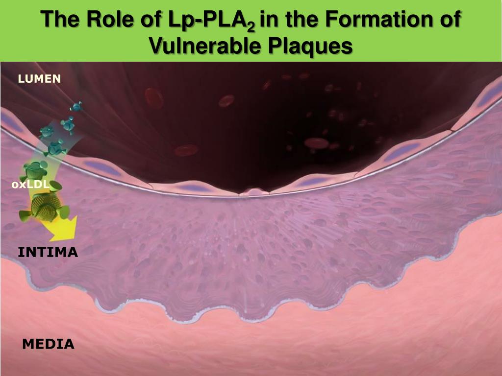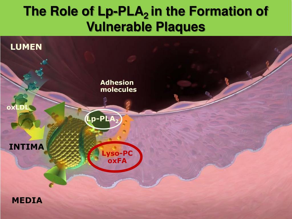 The Role of Lp-PLA2 in the Formation ofVulnerable Plaques LUMEN Monocytes Plaque formation Cytokines Adhesion molecules oxLDL Lp-PLA2 Foamcell INTIMA Macrophages Lyso-PC oxFA oxFA andLyso-PC stimulategrowthofplaque ongoing inflammation within the cap causes plaque instability MEDIA