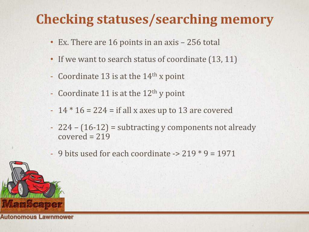 Checking statuses/searching memory • Ex. There are 16 points in an axis – 256 total • If we want to search status of coordinate (13, 11) • Coordinate 13 is at the 14th x point • Coordinate 11 is at the 12th y point • 14 * 16 = 224 = if all x axes up to 13 are covered • 224 – (16-12) = subtracting y components not already covered = 219 • 9 bits used for each coordinate -> 219 * 9 = 1971