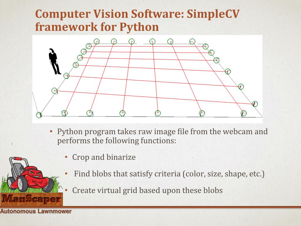 Computer Vision Software: SimpleCV framework for Python • Blah • Python program takes raw image file from the webcam and performs the following functions: • Crop and binarize • Find blobs that satisfy criteria (color, size, shape, etc.) • Create virtual grid based upon these blobs
