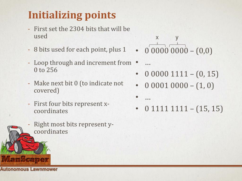 Initializing points • First set the 2304 bits that will be used • 8 bits used for each point, plus 1 • Loop through and increment from 0 to 256 • Make next bit 0 (to indicate not covered) • First four bits represent x-coordinates • Right most bits represent y-coordinates x y • 0 0000 0000 – (0,0) • … • 0 0000 1111 – (0, 15) • 0 0001 0000 – (1, 0) • … • 0 1111 1111 – (15, 15)