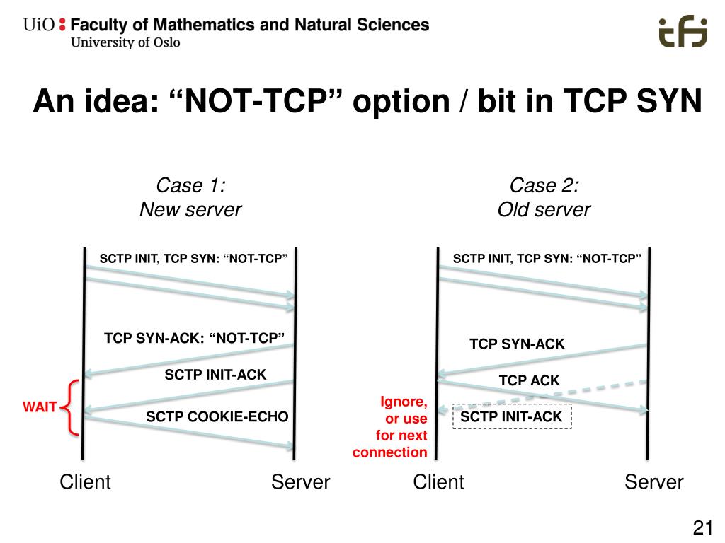 An idea: “NOT-TCP” option / bit in TCP SYN Case 1:New server Case 2:Old server SCTP INIT, TCP SYN: “NOT-TCP” SCTP INIT, TCP SYN: “NOT-TCP” TCP SYN-ACK: “NOT-TCP” TCP SYN-ACK SCTP INIT-ACK WAIT TCP ACK SCTP COOKIE-ECHO SCTP INIT-ACK Ignore, or usefor nextconnection Client Client Server Server