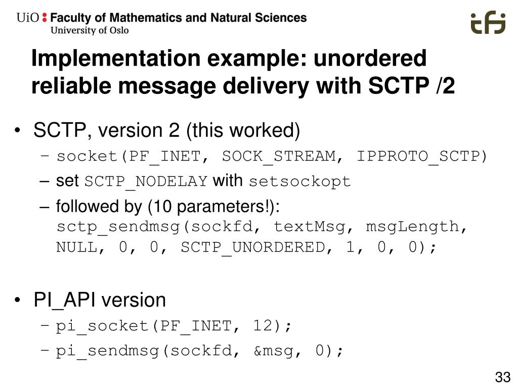 Implementation example: unordered reliable message delivery with SCTP /2 • SCTP, version 2 (this worked) • socket(PF_INET, SOCK_STREAM, IPPROTO_SCTP) • set SCTP_NODELAY with setsockopt • followed by (10 parameters!):sctp_sendmsg(sockfd, textMsg, msgLength, NULL, 0, 0, SCTP_UNORDERED, 1, 0, 0); • PI_API version • pi_socket(PF_INET, 12); • pi_sendmsg(sockfd, &msg, 0);