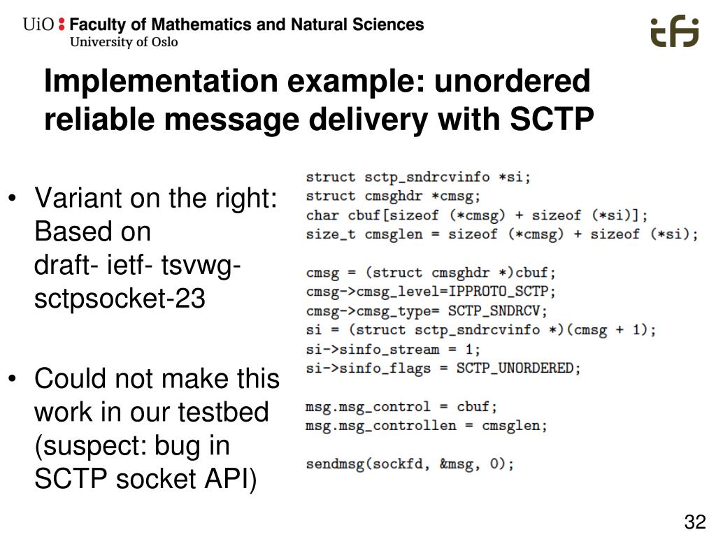 Implementation example: unordered reliable message delivery with SCTP • Variant on the right:Based ondraft- ietf- tsvwg- sctpsocket-23 • Could not make thiswork in our testbed(suspect: bug inSCTP socket API)