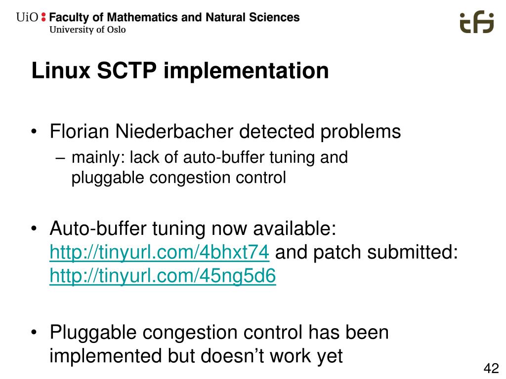 Linux SCTP implementation • Florian Niederbacher detected problems • mainly: lack of auto-buffer tuning andpluggable congestion control • Auto-buffer tuning now available:http://tinyurl.com/4bhxt74and patch submitted:http://tinyurl.com/45ng5d6 • Pluggable congestion control has been implemented but doesn’t work yet
