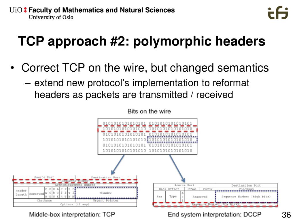 TCP approach #2: polymorphic headers • Correct TCP on the wire, but changed semantics • extend new protocol’s implementation to reformat headers as packets are transmitted / received