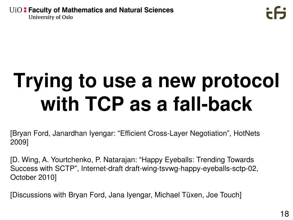 Trying to use a new protocol with TCP as a fall-back [Bryan Ford, Janardhan Iyengar: “Efficient Cross-Layer Negotiation”, HotNets 2009] [D. Wing, A. Yourtchenko, P. Natarajan: “Happy Eyeballs: Trending Towards Success with SCTP”, Internet-draft draft-wing-tsvwg-happy-eyeballs-sctp-02, October 2010] [Discussions with Bryan Ford, Jana Iyengar, Michael Tüxen, Joe Touch]