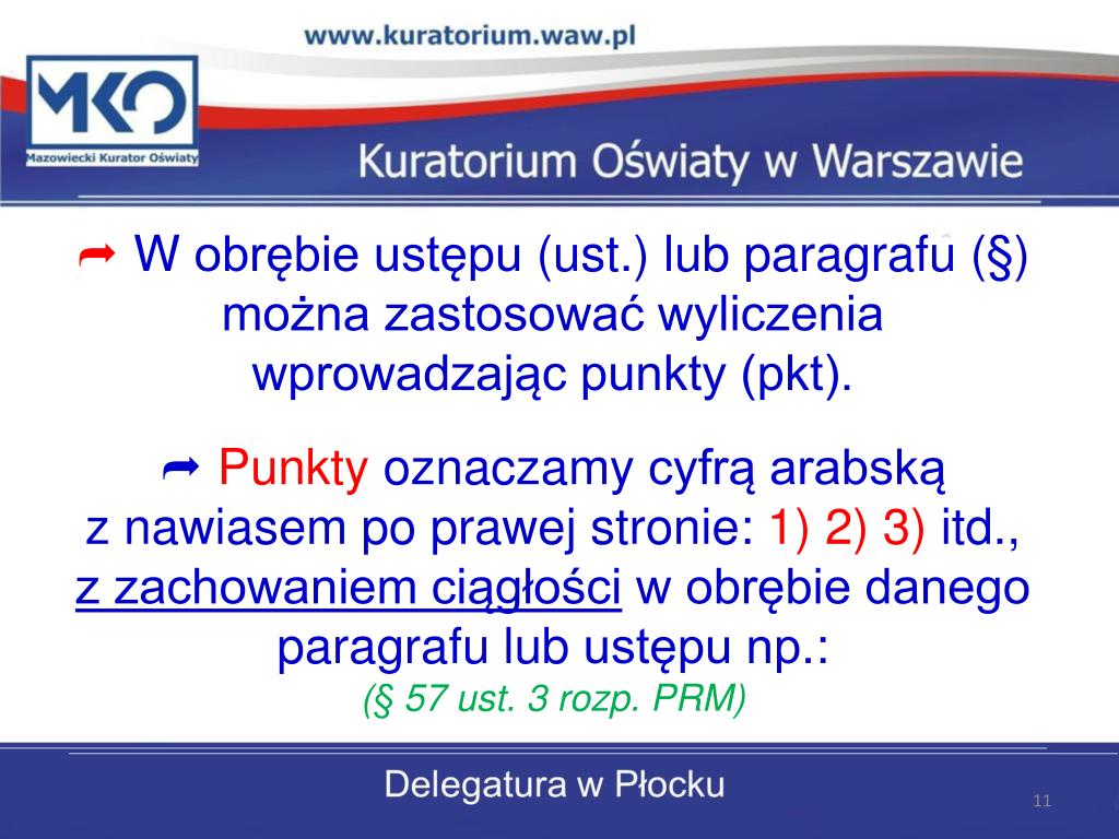 W obrębie ustępu (ust.) lub paragrafu (§) można zastosować wyliczenia wprowadzając punkty (pkt). Punktyoznaczamy cyfrą arabską z nawiasem po prawej stronie: 1) 2) 3) itd., z zachowaniem ciągłościw obrębie danego paragrafu lub ustępu np.:(§57 ust. 3 rozp. PRM)