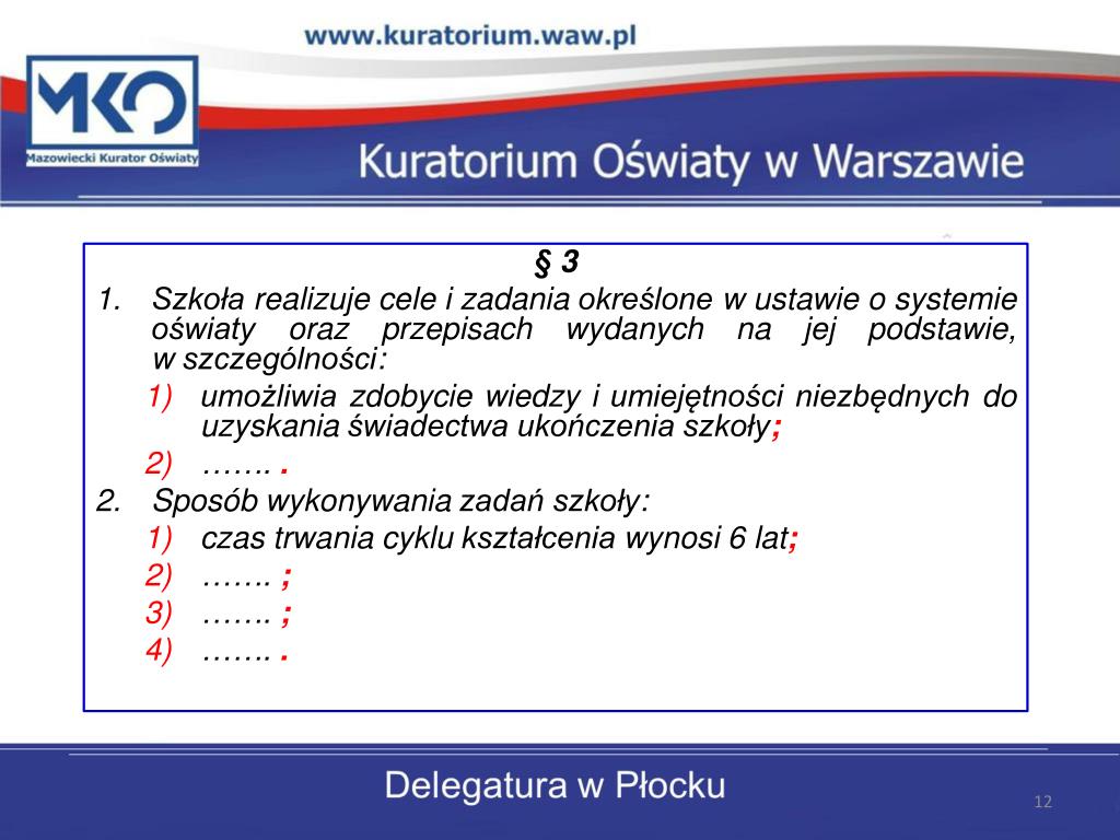 § 3 • Szkoła realizuje cele i zadania określone w ustawie o systemie oświaty oraz przepisach wydanych na jej podstawie, w szczególności: • umożliwia zdobycie wiedzy i umiejętności niezbędnych do uzyskania świadectwa ukończenia szkoły; • ……. . • Sposób wykonywania zadań szkoły: • czas trwania cyklu kształcenia wynosi 6 lat; • ……. ; • ……. ; • ……. .