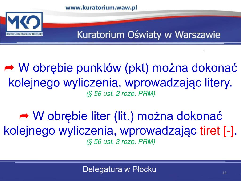 W obrębie punktów (pkt) można dokonać kolejnego wyliczenia, wprowadzając litery. (§ 56 ust. 2 rozp. PRM) W obrębie liter (lit.) można dokonać kolejnego wyliczenia, wprowadzając tiret [-]. (§ 56 ust. 3 rozp. PRM)