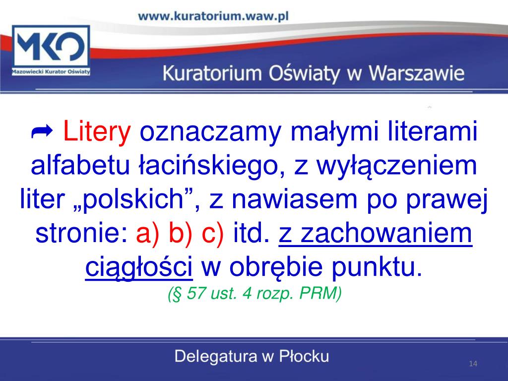 Litery oznaczamy małymi literami alfabetu łacińskiego, z wyłączeniem liter „polskich”, z nawiasem po prawej stronie: a) b) c) itd. z zachowaniem ciągłości w obrębie punktu. (§ 57 ust. 4 rozp. PRM)