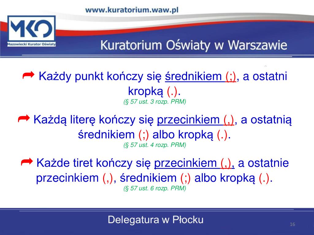 Każdy punkt kończy się średnikiem (;), a ostatni kropką (.). (§ 57 ust. 3 rozp. PRM) Każdą literę kończy się przecinkiem (,), a ostatnią średnikiem (;) albo kropką (.). (§ 57 ust. 4 rozp. PRM) Każde tiret kończy się przecinkiem (,), a ostatnie przecinkiem (,), średnikiem (;)albo kropką (.).(§ 57 ust. 6 rozp. PRM)
